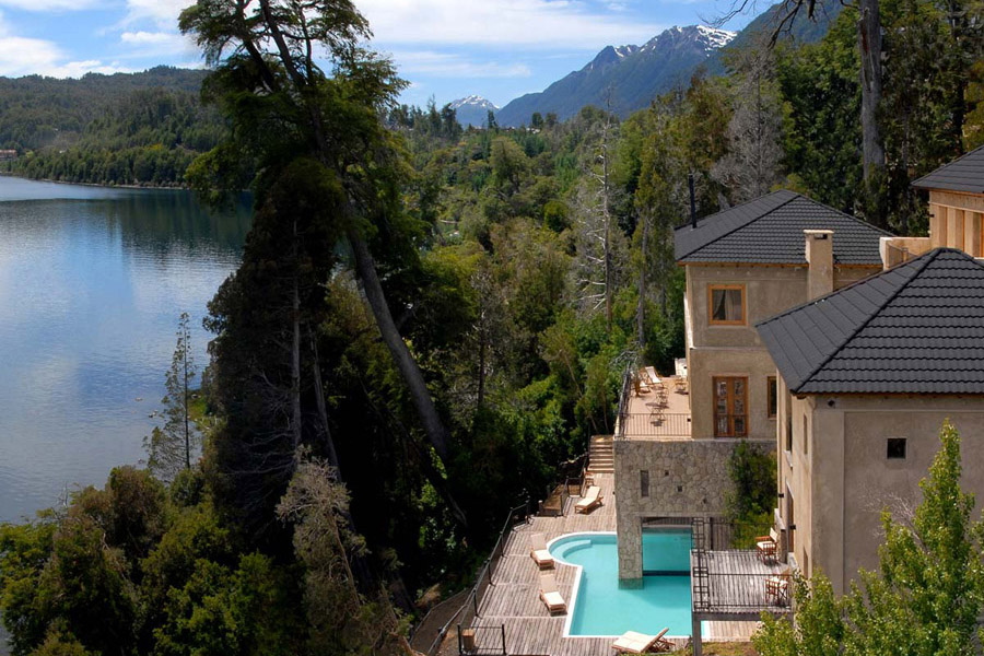Localizada en una loma natural con vista panorámica de 180 ° frente al lago Nahuel Huapi y la Cordillera de los Andes